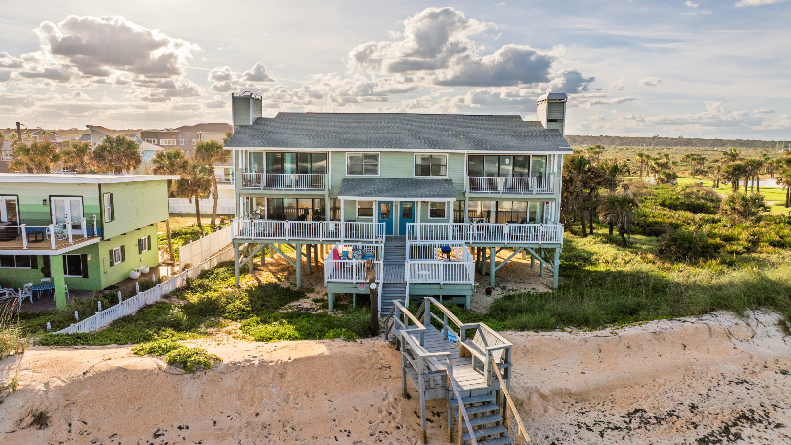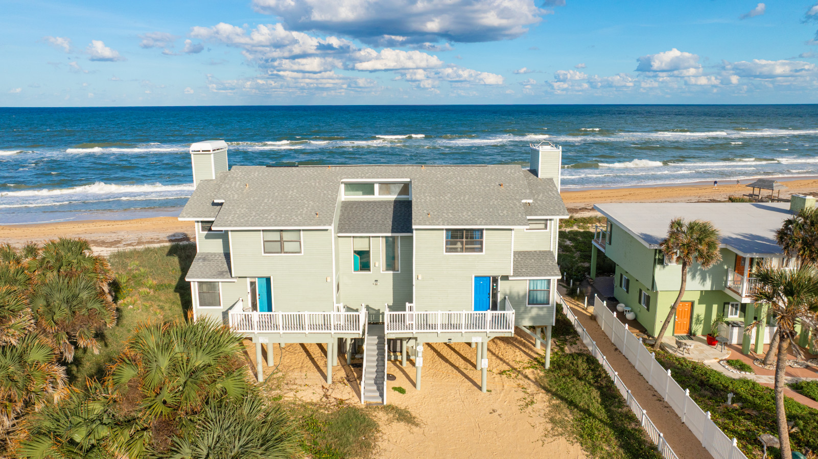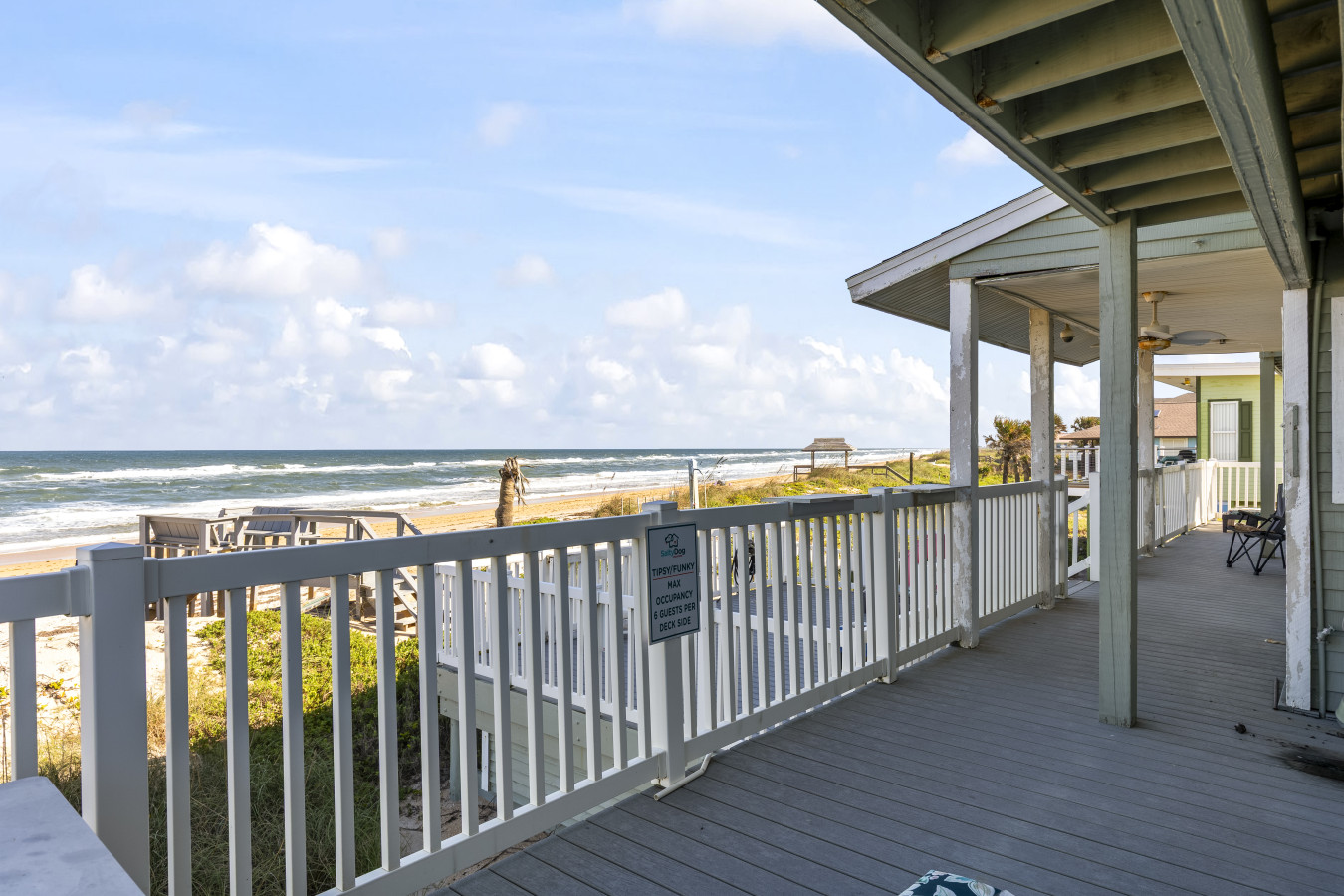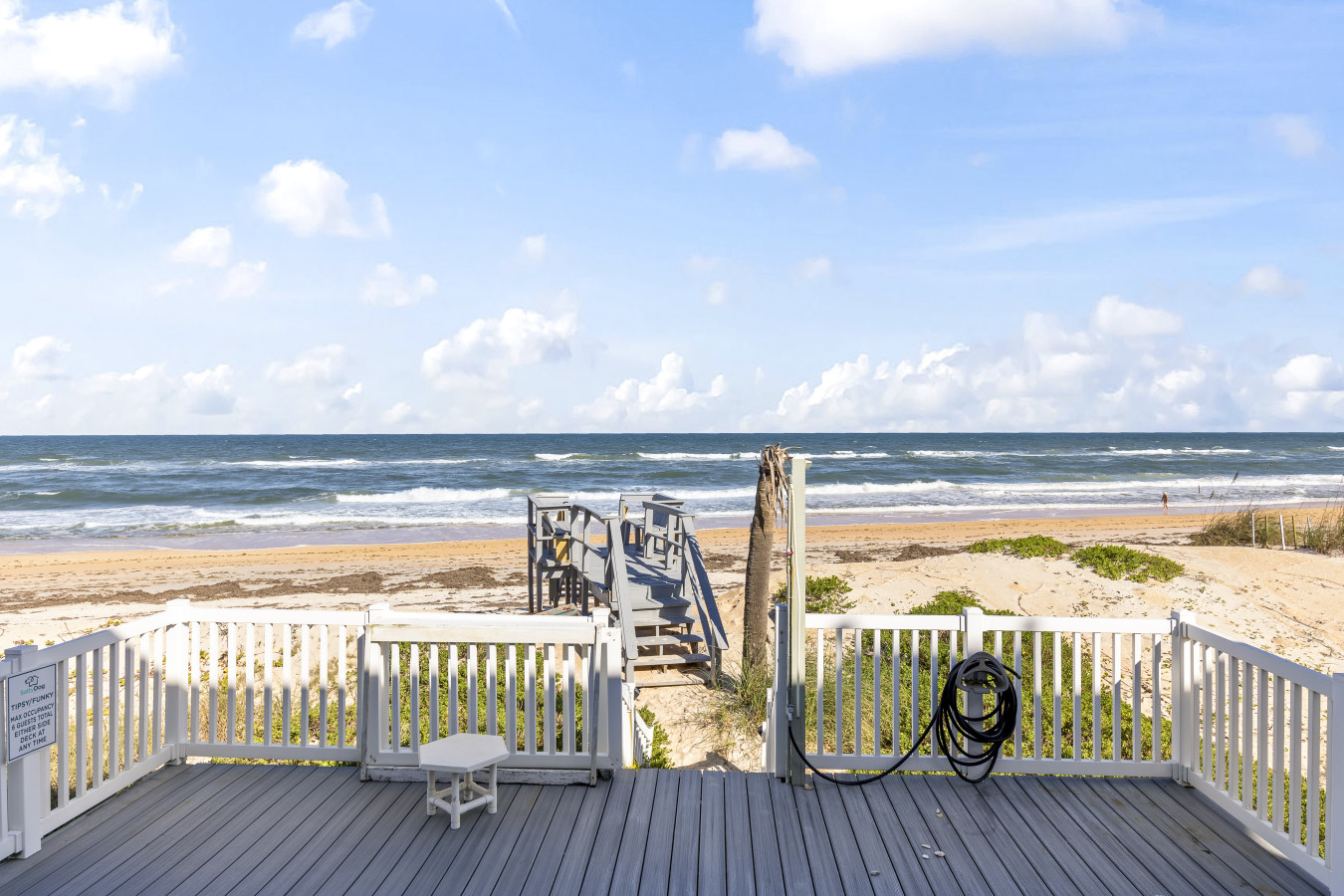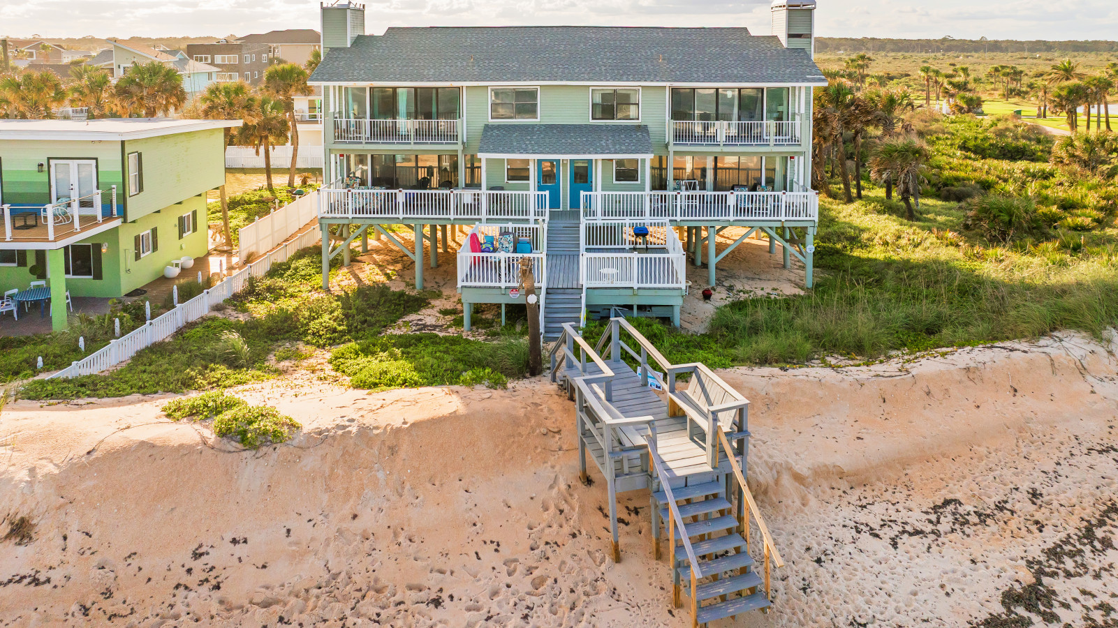 Nestled between Flagler Beach and St. Augustine, the home offers a private, dog-friendly stretch of beach with a serene coastal vibe. Sip your morning coffee while watching the sunrise, and unwind with a cocktail as the sun sets over the dunes.