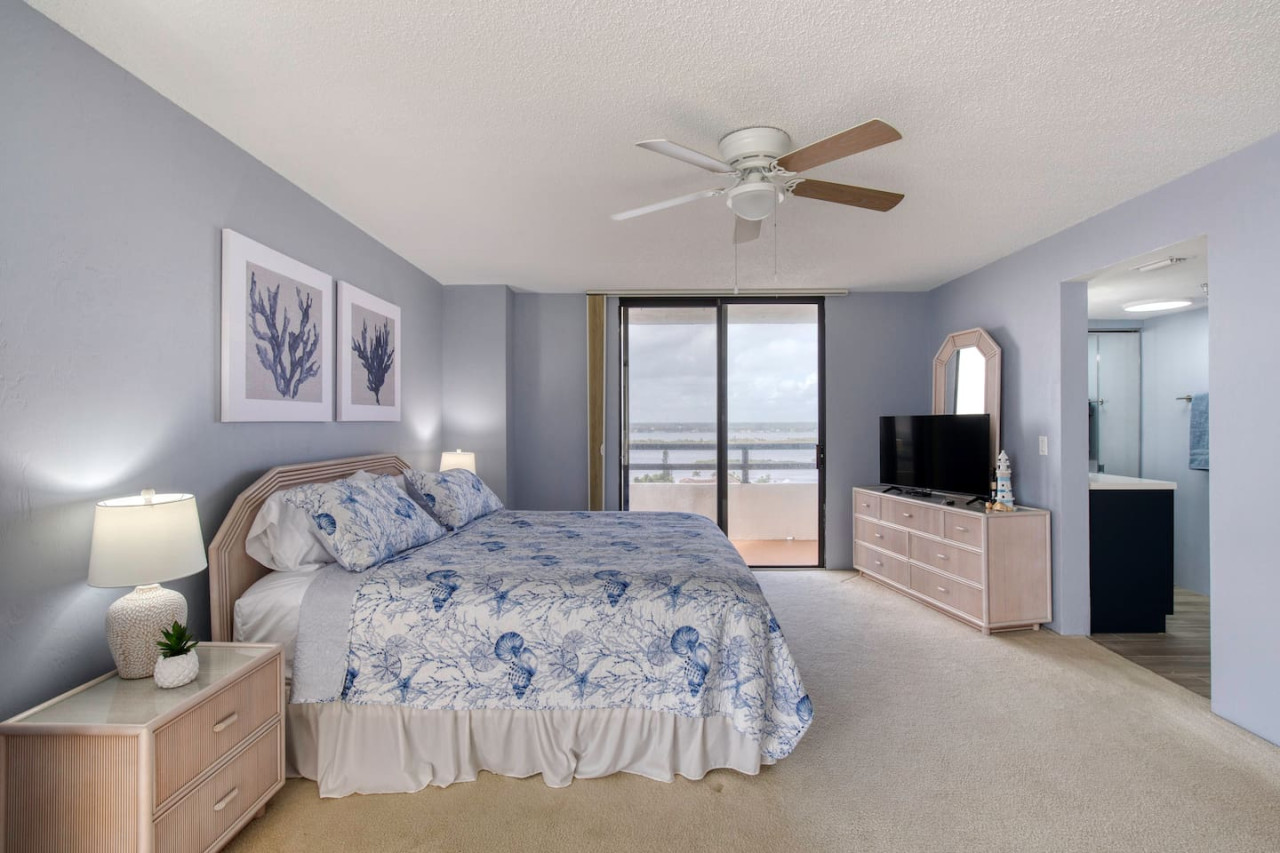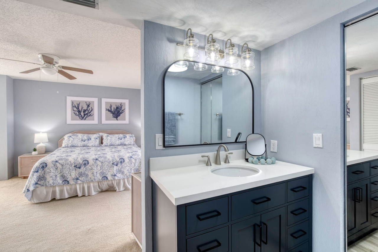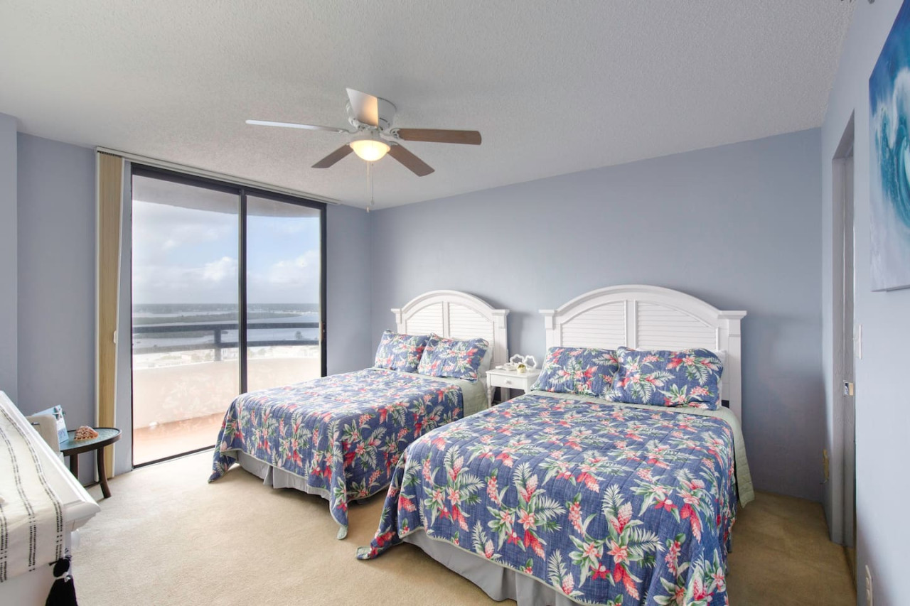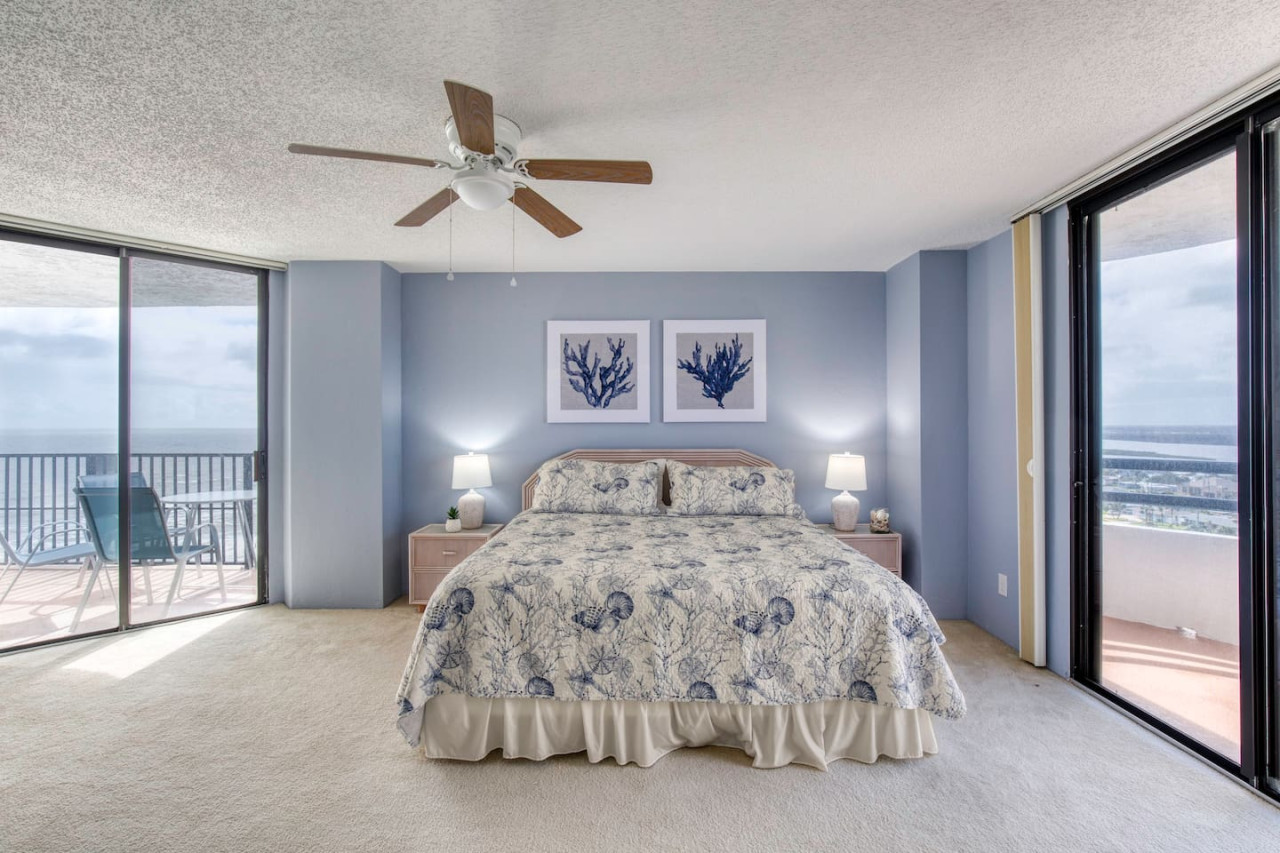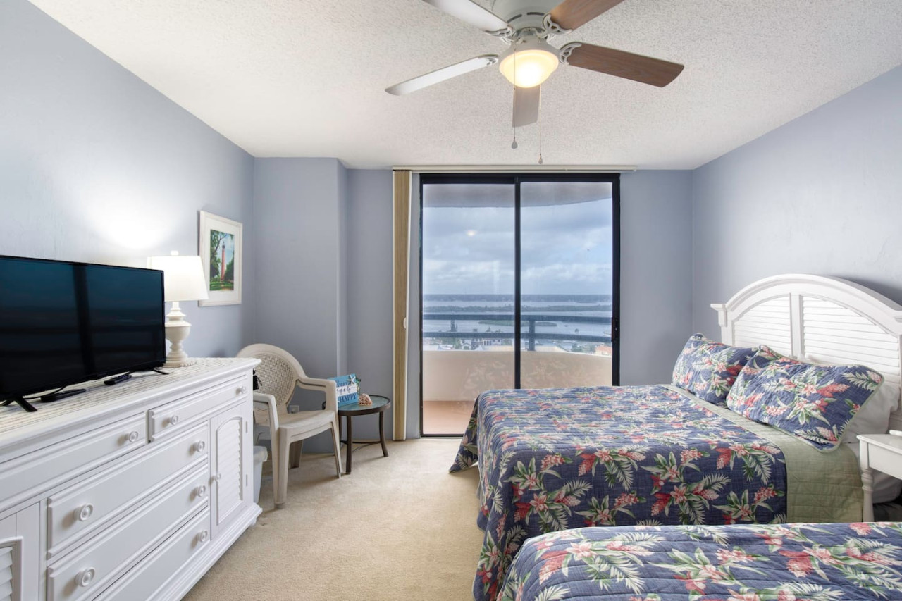 Both bedrooms in the condo are designed with comfort and convenience in mind. Each bedroom features spacious walk-in closets, ensuring ample storage for personal belongings. Private balconies attached to both rooms provide additional opportunities to enjoy the scenery in solitude. The master bedroom stands out with its two separate sink areas, enhancing the morning routine for couples or families sharing the space. Each bathroom is designed with functionality and style, catering to the needs of guests.