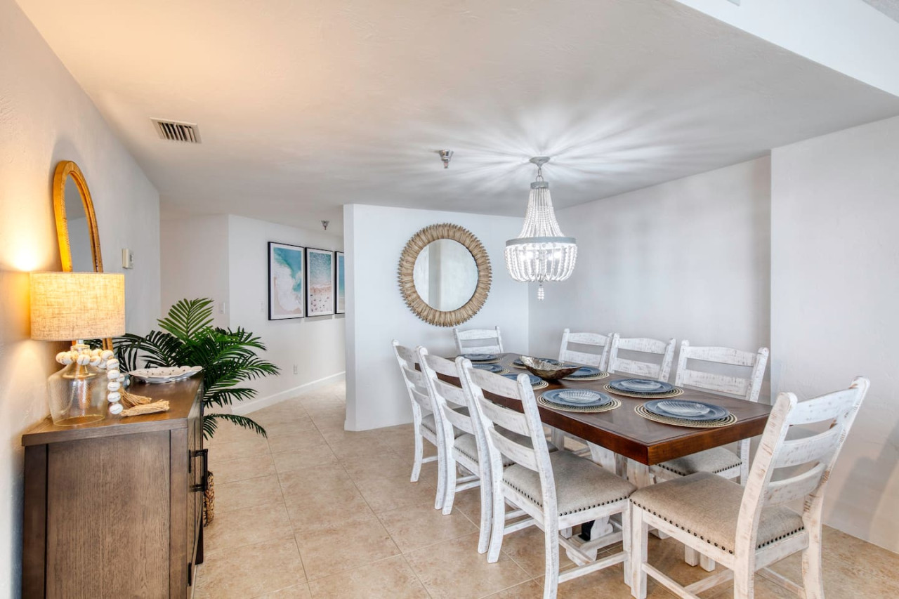 Upon entering this paradise condo, one is immediately struck by the spacious interiors that blend seamlessly with the breathtaking surroundings. The living room, adorned with comfortable new furniture, serves as the perfect gathering spot for family and friends. It Boasts a large television, making it an excellent space for movie nights or catching up on your favorite shows. The open layout allows for easy movement from the living area to the dining room, which features a table that comfortably seats eight—a perfect venue for shared meals and laughter.